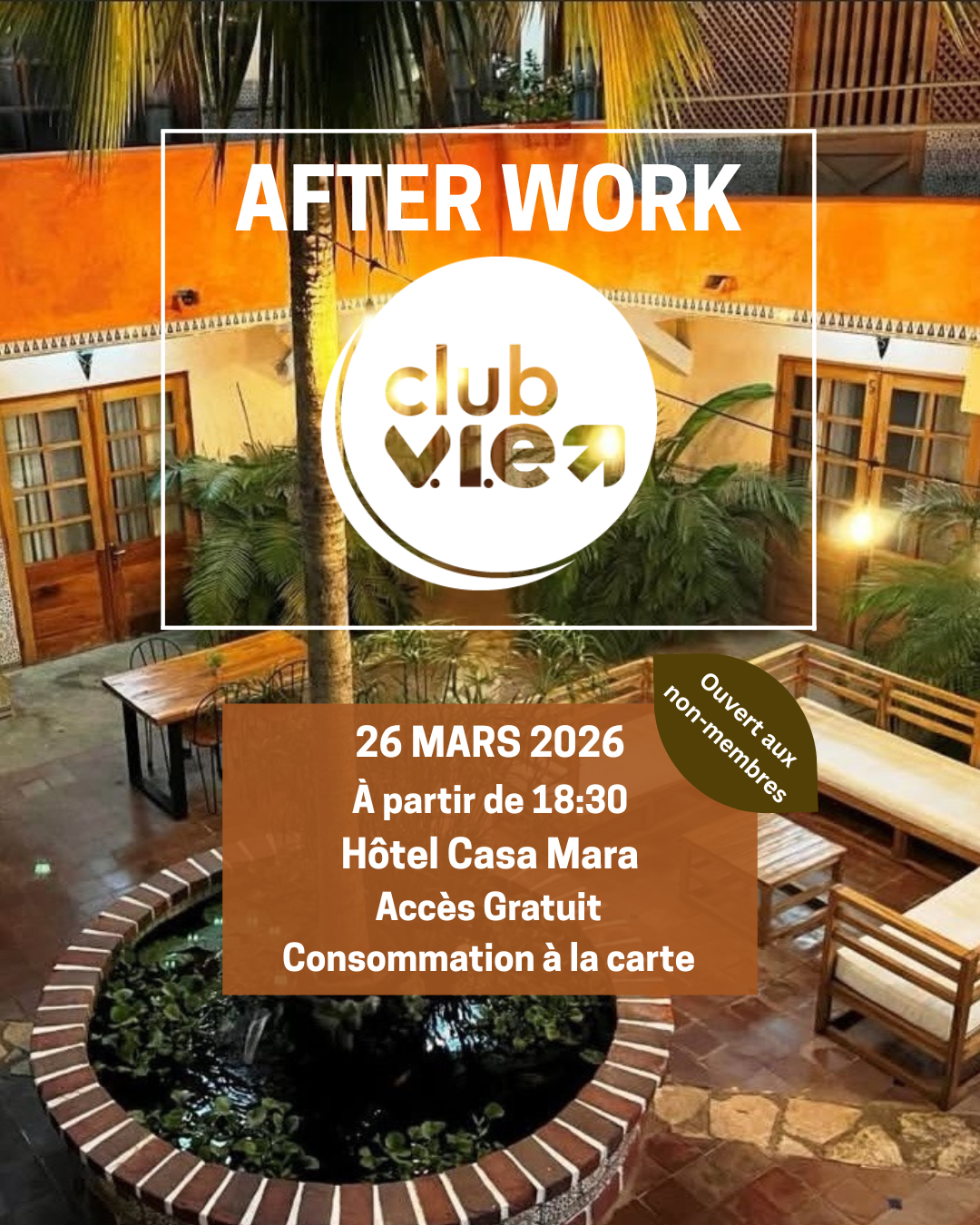 Nous sommes ravis de vous convier au 6e Afterwork du Club V.I.E Sénégal ! Nous pourrons nous retrouver, accueillir les nouveaux arrivants et partager un moment convivial autour d’un verre face à la mer.![]()