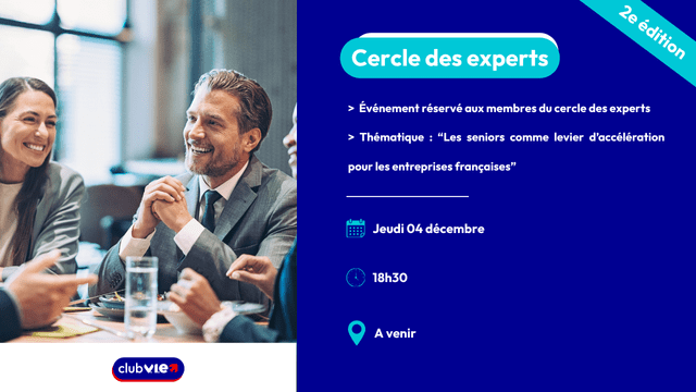 Nous avons le plaisir de vous inviter à la deuxième édition du Cercle des Experts, qui se tiendra le jeudi 4 décembre 2025 à partir de 18h30, sur le thème : « Les seniors comme levier d’accélération pour les entreprises françaises »