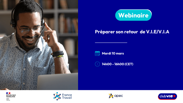 👉 Ce Webatelier interactif de 2h sera encadré par des intervenants experts de l'APEC, France Travail International et du Club V.I.E. Ils vous présenteront ainsi les nombreux services dont vous pourrez bénéficier pour faciliter votre retour professionnel.