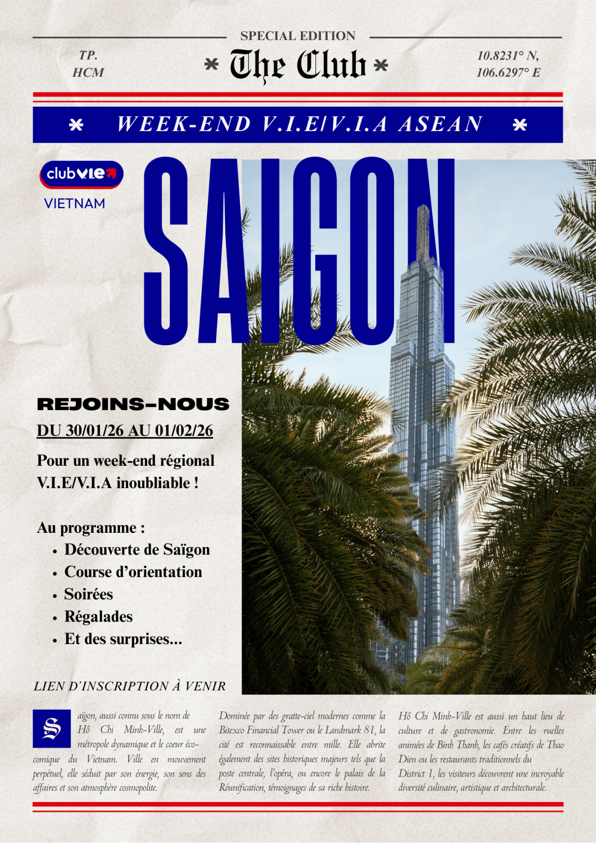 Du 30 janvier au 1er février 2026, rejoignez toute la communauté V.I.E / V.I.A d’Asie du Sud-Est pour un week-end régional inoubliable au cœur de l’une des villes les plus dynamiques du continent : Hô Chi Minh-Ville.